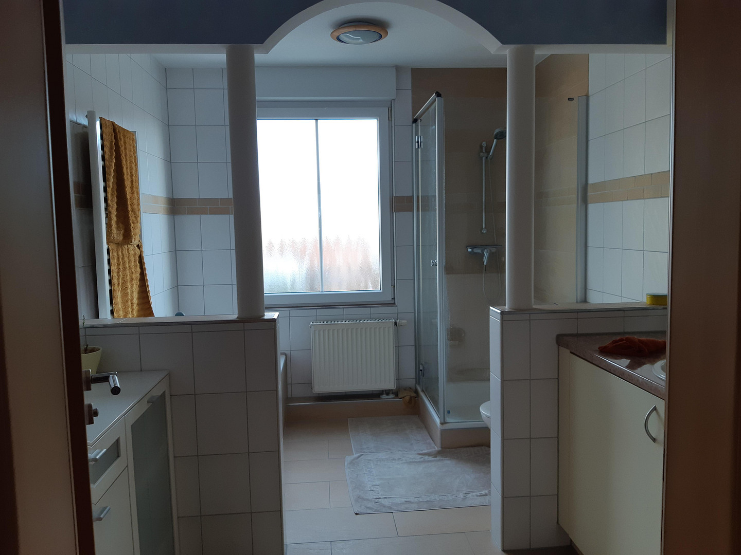 Jedes Fenster mit Außenrollo. Waschtische mit Unterschrank in den Bädern. Bäder raumhoch gefliest.