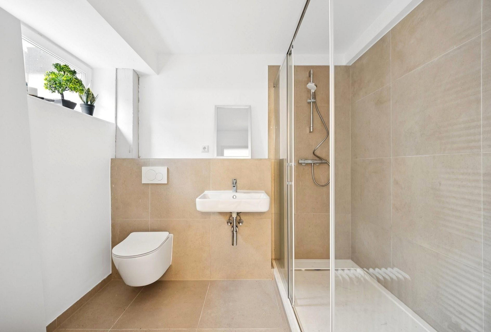 Im Erdgeschoss liegt eine 2025 neu ausgebaute, barrierearme Wohnung mit großer Süd-Fensterfront, schönem Tageslichtbad mit großer Dusche und einer Terrasse zum Hof auf der Hausrückseite. Der offene Schnitt bietet hier eine Aufteilung in bis zu 3 Zimmer an.