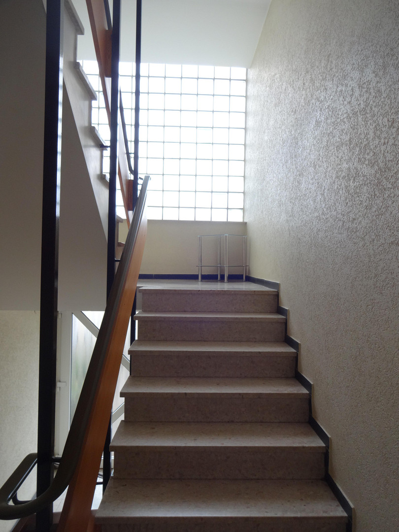 Jede Wohnung hat 3 Schlafzimmer, Küche, Bad ( Tageslichtbad ), Gäste-WC und einen großen Raum, welcher aus Wohn-und Esszimmer besteht. Beiden Räume werden durch einen Bogendurchgang etwas voneinander abgetrennt.