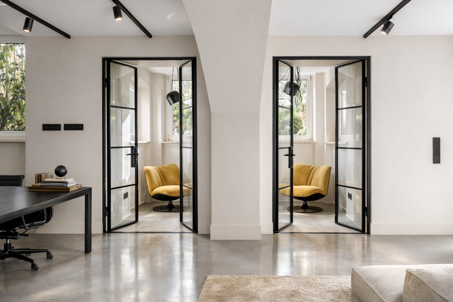 Maßanfertigungen, hochwertige Materialien und ein ruhiges, repräsentatives Raumgefühl schaffen eine außergewöhnliche Arbeitsumgebung direkt am Landwehrkanal.