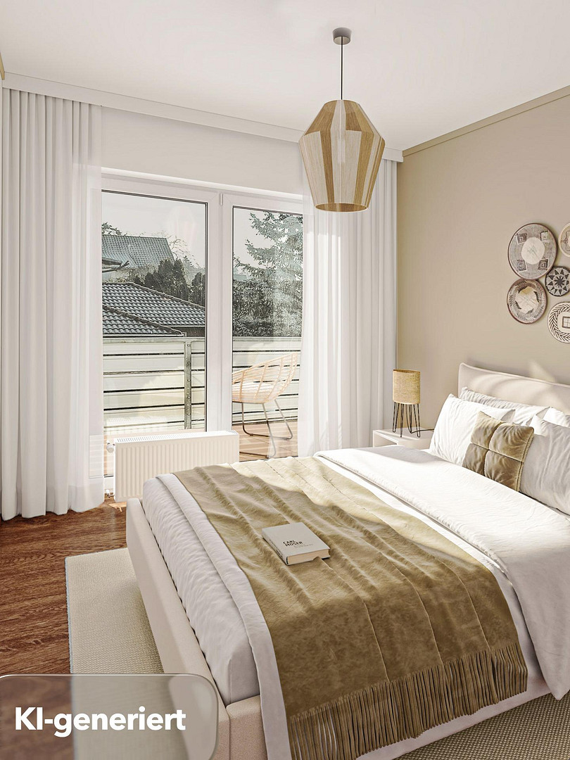 Mit Ausnahme der Einbauküche und der Badmöbel, die sich real in der Wohnung befinden ist die Möblierung des Wohnzimmers, des Schlafzimmers und des Erkerzimmers in den Bildern virtuell dargestellt. Die KI-Generierung ist in den Bildern jeweils entsprechend gekennzeichnet.