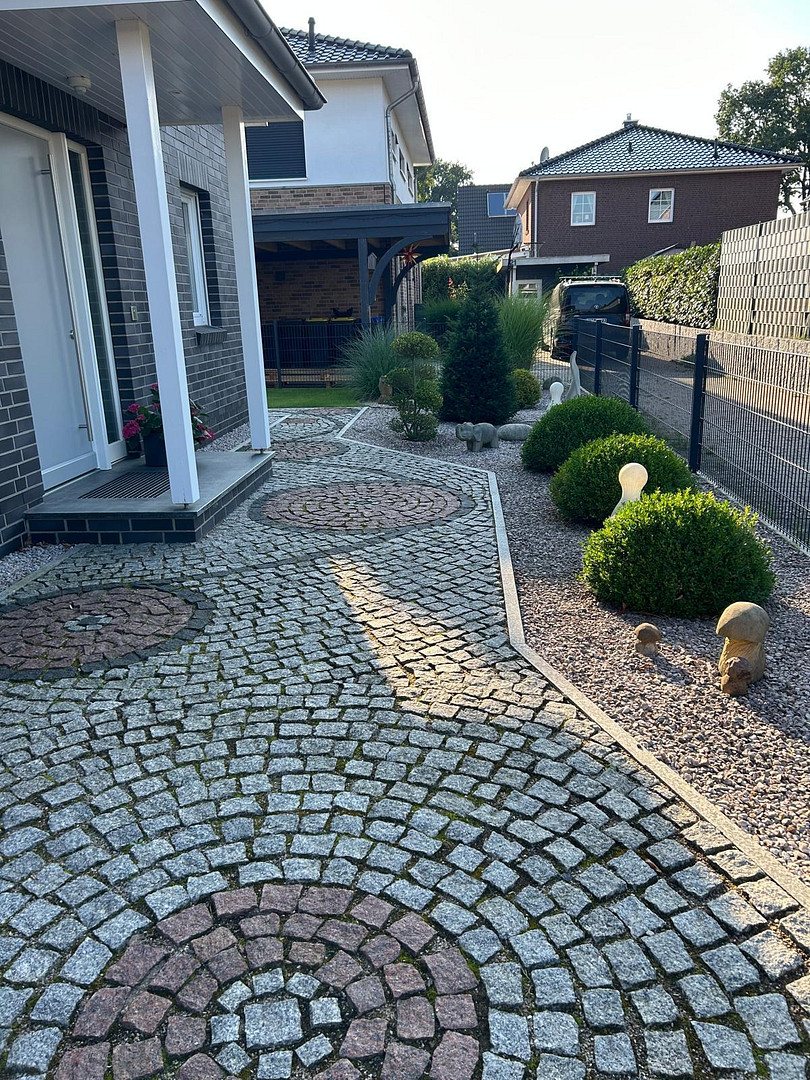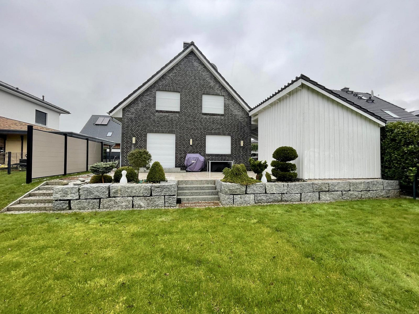 Auch außen zeigt sich die Immobilie sehr ordentlich und hochwertig. Das Grundstück ist komplett eingefriedet. Die Außenanlagen sind sehr gepflegt mit langlebigem, zeitlosen Naturstein. Naturstein in Untergeschoss, Küche, Kamin, Einfahrt und Garten sowie ein elektrisches Tor unterstreichen den durchdachten Gesamteindruck.