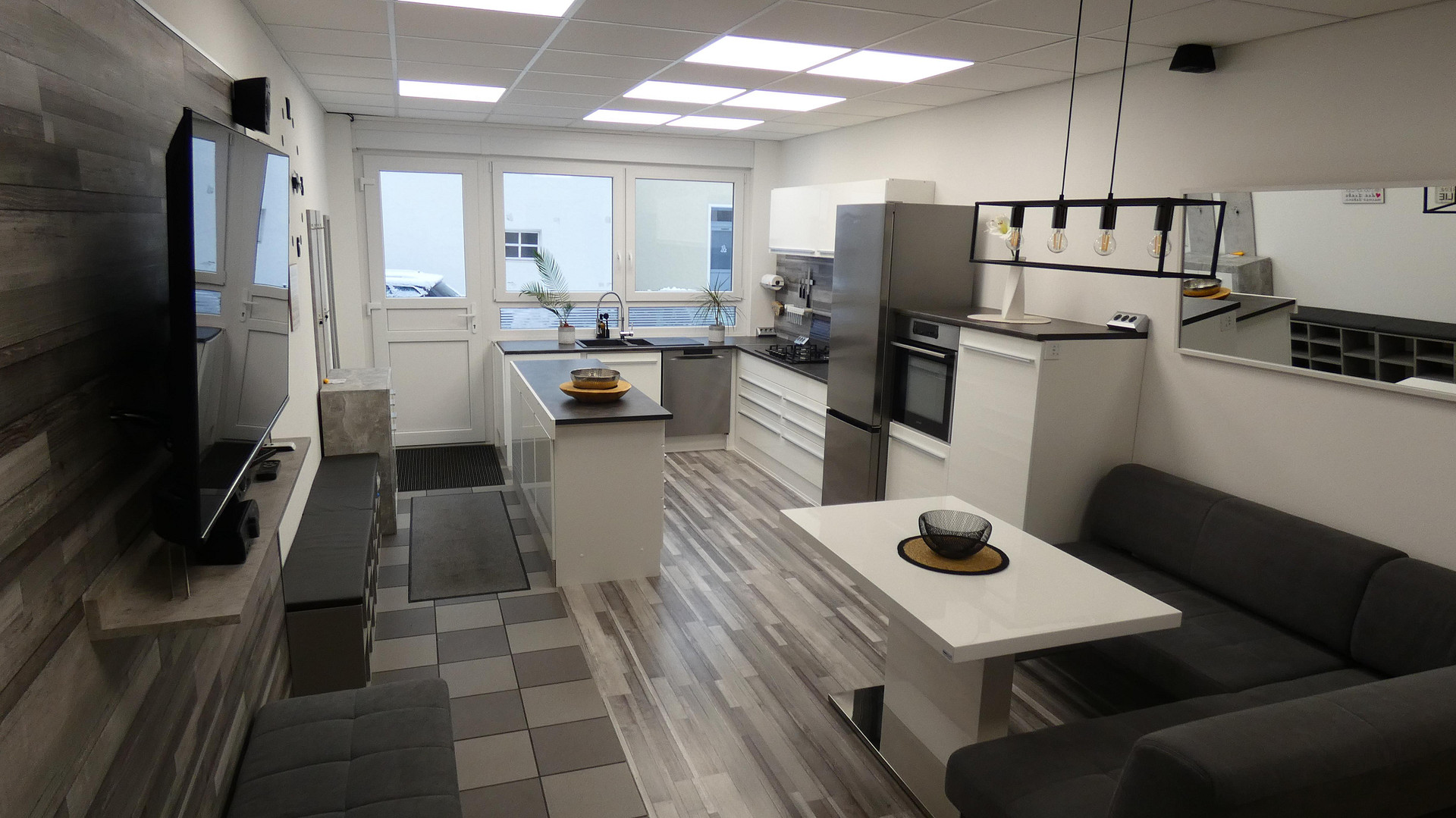 Erdgeschoss: Lichtdurchfluteter Wohn- und Essbereich mit großen Fenstern, moderner Einbauküche und separater TV-Wand.