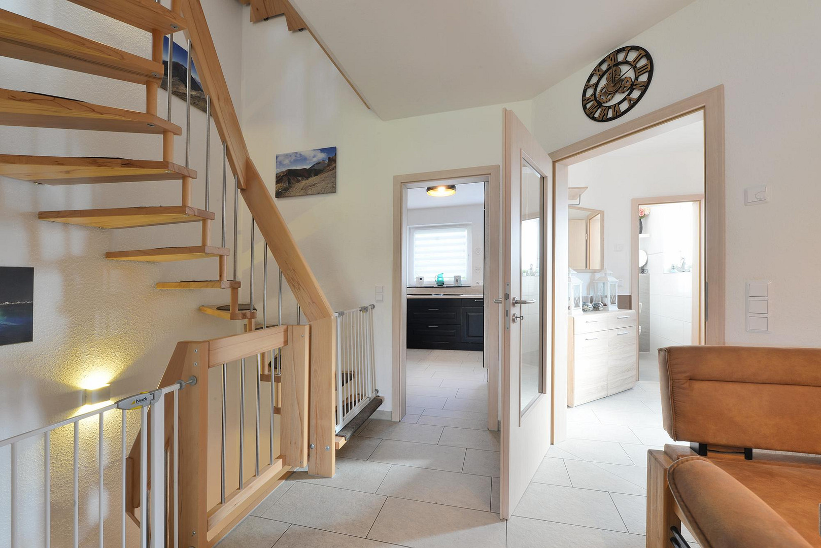 Zudem haben wir auch mögliche zukünftige Wünsche mit berüchsichtigt. Es existiert beispielsweise eine Badvorbereitung für ein zweites Badezimmer im Dachgeschoss sowie eine getrennte Lichtsteuerung für einen weiteren Ausbau des Dachgeschosses in mehrere Zimmer. Eine SAT-Vorbereitung ist ebenfalls vorhanden. In der Garage befindet sich außerdem ein Starkstrom-Anschluss, so dass beispielsweise eine Wallbox einfach eingesteckt werden kann.