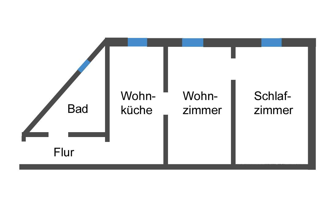 Mit ca. 54 m² Wohnfläche umfasst die Wohneinheit zwei Zimmer, wovon eines ein Durchgangszimmer ist, eine große Wohnküche mit Einbauküche, ein saniertes Tageslichtbad sowie einen Flur.