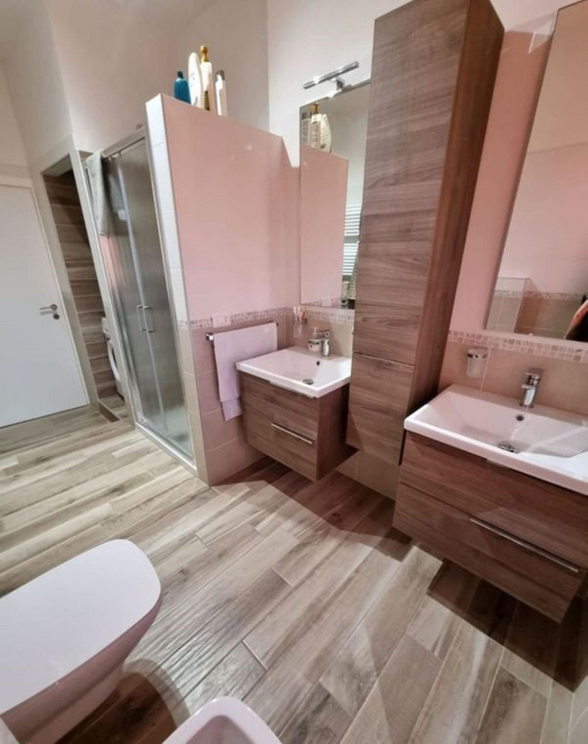 Badezimmer mit Dusche, Waschbecken und modernen Armaturen