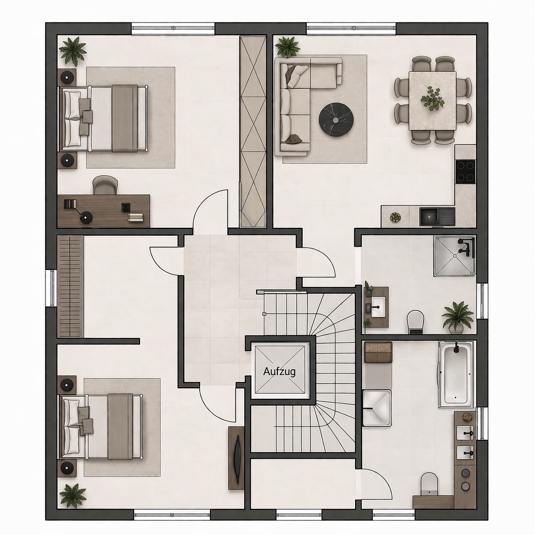 Ein besonderes Highlight ist der integrierte Personenaufzug, der die Ebenen komfortabel verbindet und das Haus barrierearm sowie zukunftssicher macht.