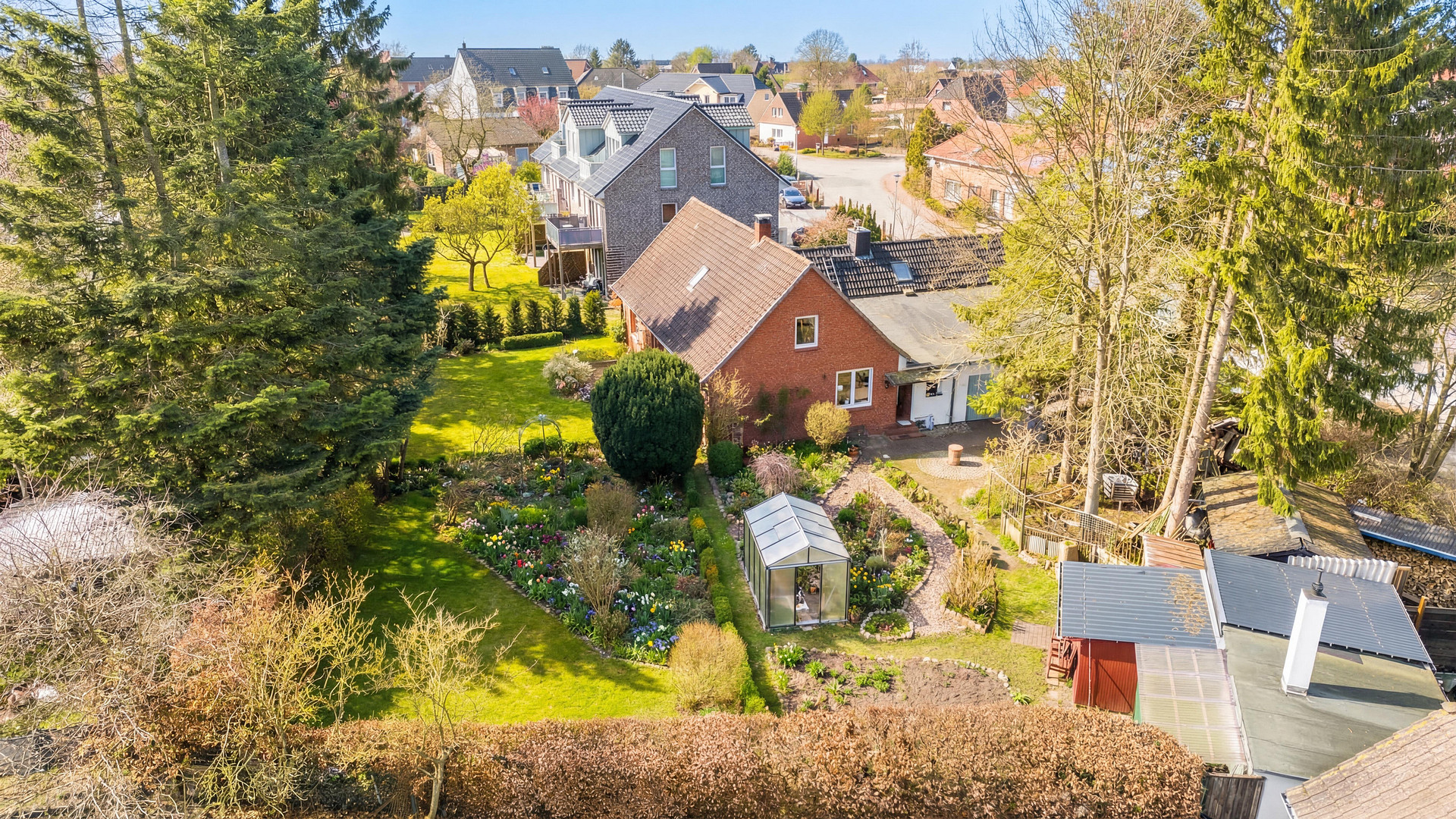 Das Haus verfügt über einen gepflegten, alten ca. 600 m² großen Bauerngarten mit altem Baumbestand, Rasen und Gemüseanbauflächen sowie zwei Gewächshäusern und zwei Gerätehäusern – Eichhörnchen, Igel und viele Vogelarten sind Dauergäste. Das Grundstück ist durch Hecken komplett eingefriedet und bietet Privatheit. Es besteht eine gute, freundliche Nachbarschaft.