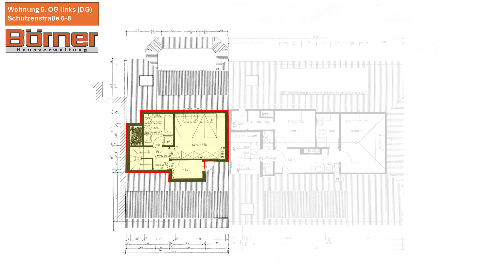 Die Wohnung ist durch den Aufzug im Haus bequem erreichbar. Für eine optimale Organisation des Alltags verfügt die Wohnung über zwei praktische Abstellräume, einen auf jeder Etage. Ein eigener Kellerraum sowie ein gemeinschaftlicher Raum zum Wäschetrocknen runden das Platzangebot ab. Dank der Lage in der 5. Etage genießen Sie hier eine ruhige Atmosphäre hoch über den Dächern der südlichen Vorstadt.