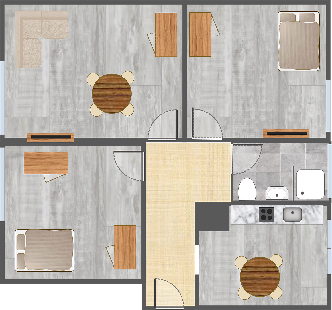 Bestehend aus 3 etwa gleich großen Zimmern mit ca. 15qm + separater Küche + Badezimmer.