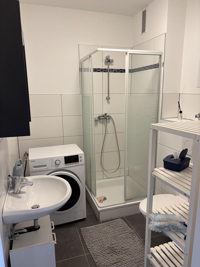 Ein Kellerabteil bietet zusätzlichen Stauraum. Zu der Ausstattung der Wohnung gehören eine Einbauküche, Tisch und Stühle, Sofa, Fernsehtisch, Couchtisch, Fernseher, Bett, Regal, Kleiderschrank, Badeinrichtung und eine Waschmaschine.