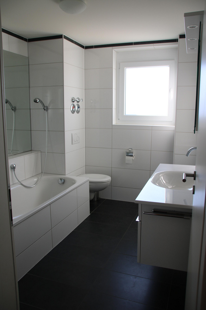 - Tageslichtbad mit Dusche und Badewanne, großem Spiegel, Unter- und Spiegel-Oberschrank sowie großem Handtuchheizkörper