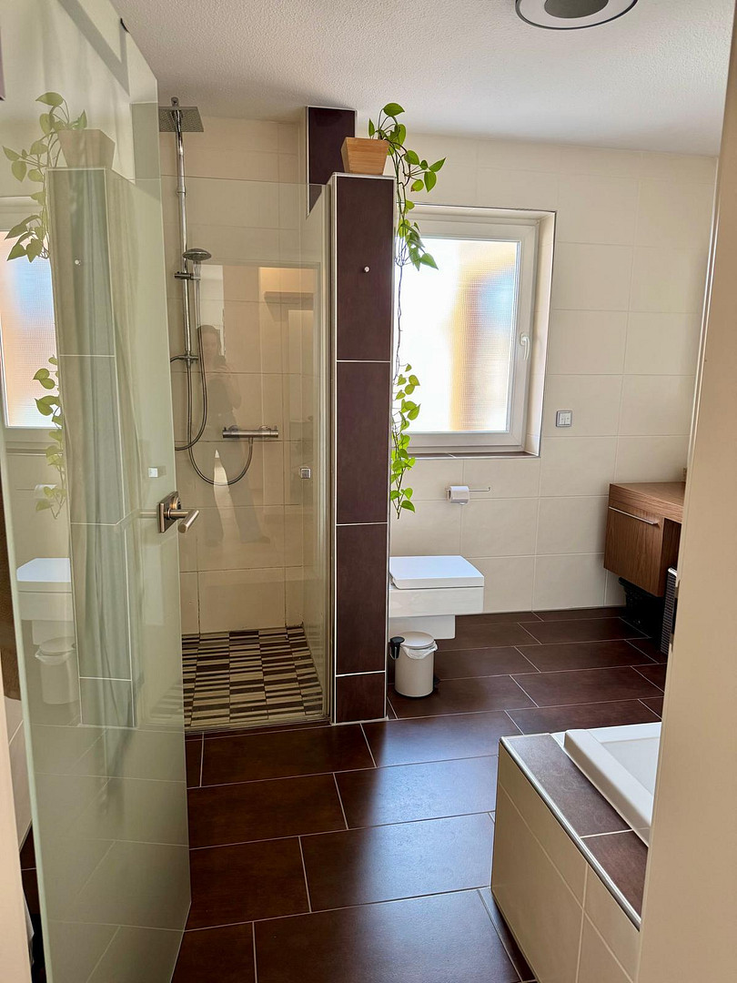 o Badezimmer mit großer, ebenerdiger Dusche und Badewanne
