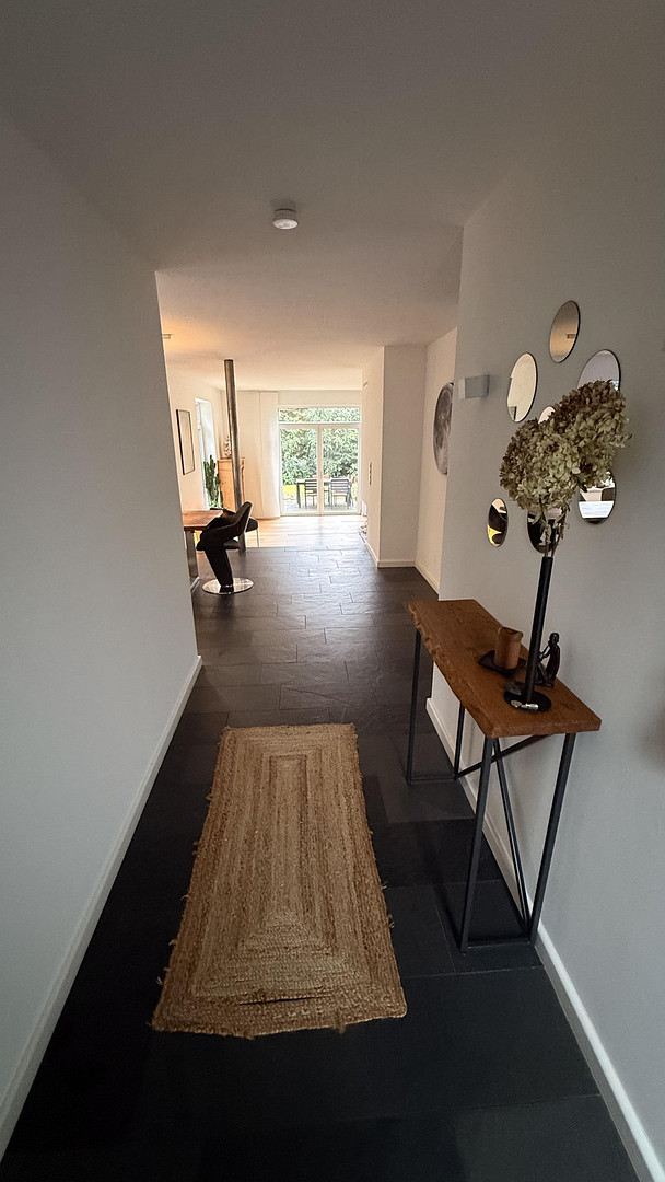 Edles Eichenparkett und Schieferstein-Böden treffen auf zeitlos schlichte, weiße Innentüren.