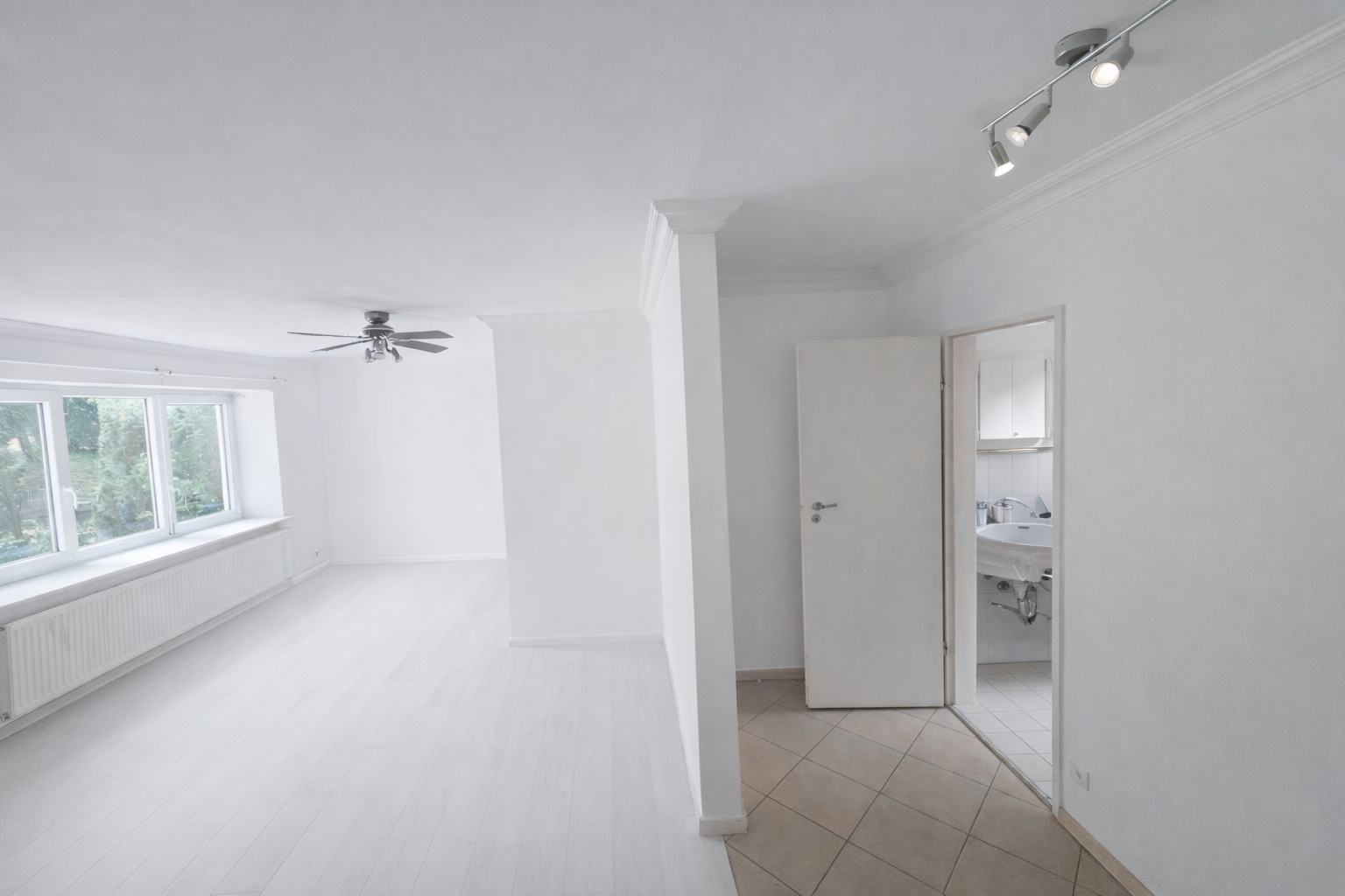 Die Wohnungseingangstür befindet sich gartenseitig. Aus dem Wohnraum hat man einen Blick in den grünen Garten.