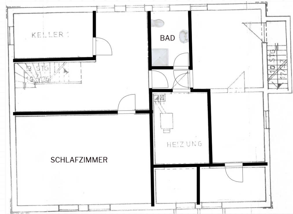 Vom Essbereich führt eine geflieste Treppe ins Untergeschoss. Unserer Erdgeschosswohnung sind 78 qm des Kellers zugeordnet, darunter ein separater Abstellraum sowie der Heizungskeller. Im Souterrain befindet sich ein 31 qm großer ausgebauter und beheizter Wohnraum mit 2,16 m Deckenhöhe und 2 kleineren Fenstern, die für Tageslicht sorgen und bei Bedarf entsprechend vergrößert werden könnten. Hier ist ein Vinylboden mit Eichendekor verlegt. Daneben liegt ein Duschbad. Der große Vorraum kann ggf. mit einer Küche ausgestattet werden. Aktuell wird er als Waschraum genutzt.