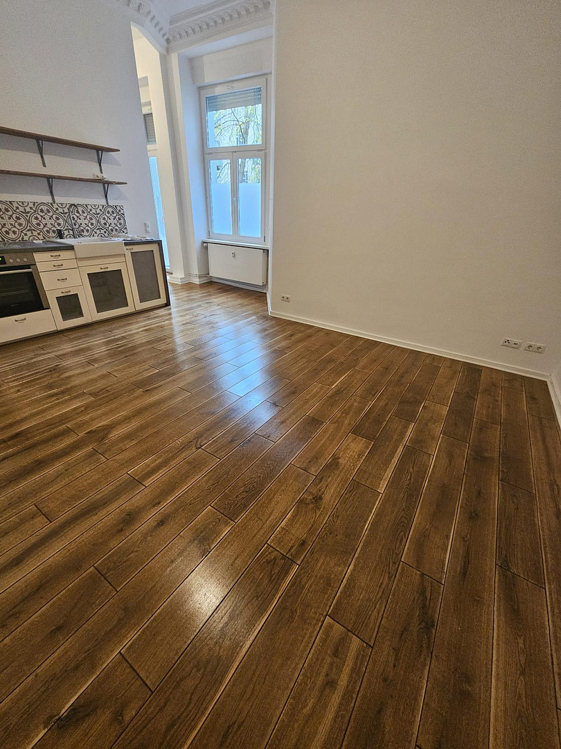 Es handelt sich um eine renovierte Altbauwohnung, die erst kürzlich neu gestrichen wurde und mit ihren klassischen Details überzeugt: hohe Decken, stilvoller Stuck sowie großzügige Fenster.