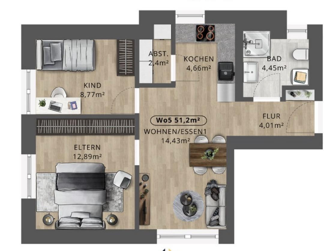 Vogesenstr. 30, 77964 Kehl-Marlen (Marlen) – Baden-WürttembergDiese attraktive 3-Zimmer-Neubauwohnung in Kehl-Marlen überzeugt mit ca. 53 m² Wohnfläche und einem durchdachten Grundriss – ideal für Singles oder Paare. Der Erstbezug im energieeffizienten KfW-40 QNG-Standard bietet modernen Wohnkomfort in ruhiger Lage. Neben 2 Schlafzimmern verfügt die Wohnung über einen hellen Wohn- und Essbereich, ein Badezimmer sowie eine praktische Abstellkammer. Eine Einbauküche (zzgl. 79 € mtl.) sowie ein Stellplatz (zzgl. 59 € mtl.) runden das Angebot ab. Die Nähe zur Kehler Innenstadt (ca. 5 Minuten) sowie die gute Anbindung an die A5 und Richtung Offenburg machen die Lage besonders attraktiv.