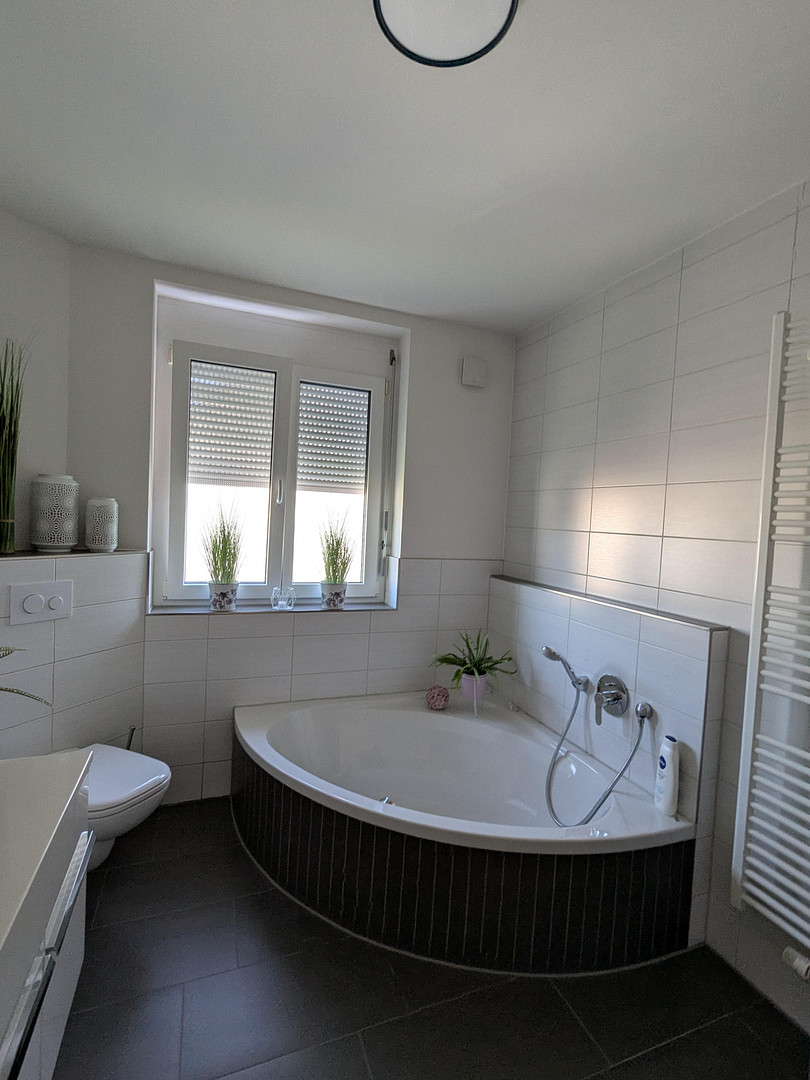 Das Tageslichtbad auf der unteren Ebene ist großzügig gestaltet und mit Badewanne, Dusche sowie einem Handtuchheizkörper ausgestattet.