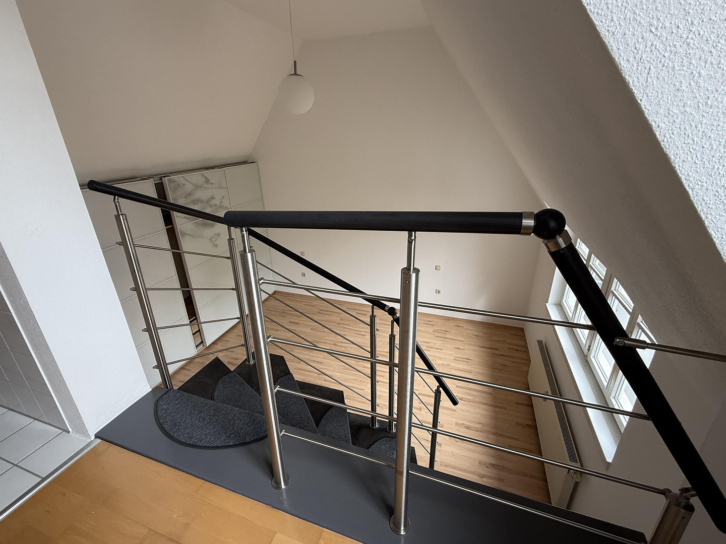 Über eine Treppe gelangen Sie in den privaten Bereich der Wohnung. Ein großzügiger Flur mit praktischer Einbaukommode führt in das Tageslicht-Duschbad sowie in das erste Schlafzimmer. Das Master-Schlafzimmer verfügt über ein eigenes, elegant gestaltetes Badezimmer mit Badewanne und bietet mit ca. 20 m² sowie einem bereits integrierten Einbauschrank hohen Wohnkomfort.