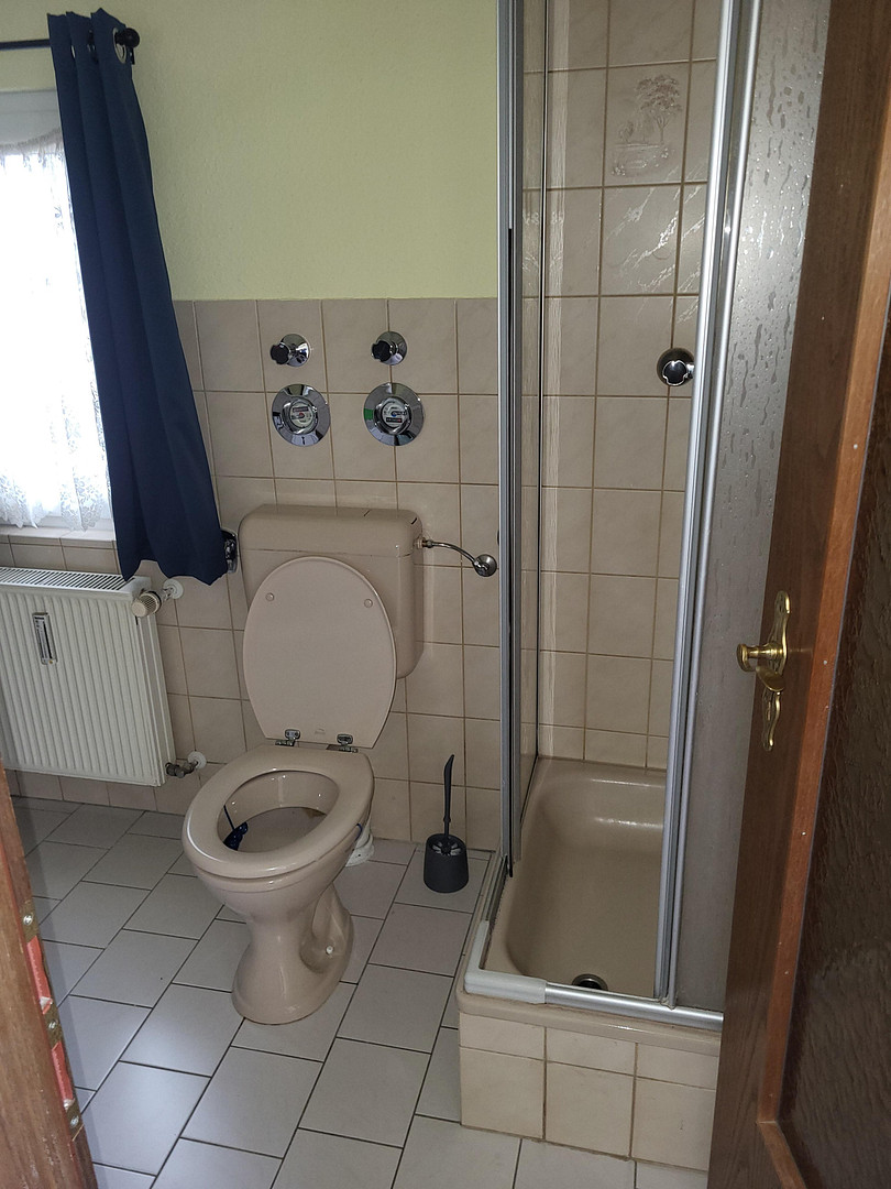 Die Fußböden sind mit Laminat und Teppichboden belegt, im Bad gefliest.