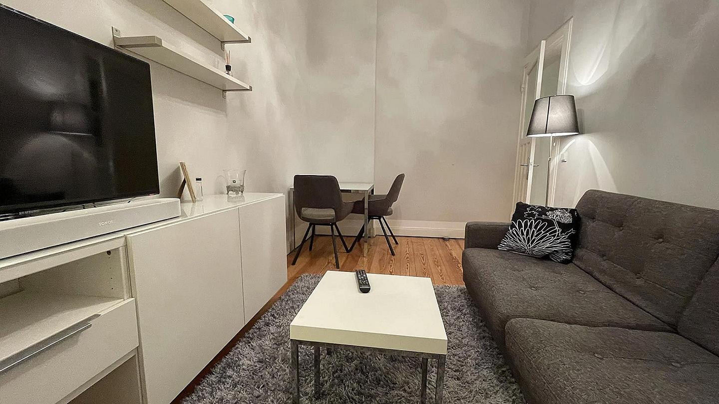 20459 Hamburg (Neustadt)Das schöne und helle Wohnzimmer ist mit einem gemütlichen, großen Schlafsofa, einem großen Schrank sowie einem Flat-TV (Kabel-Anschluss) eingerichtet.