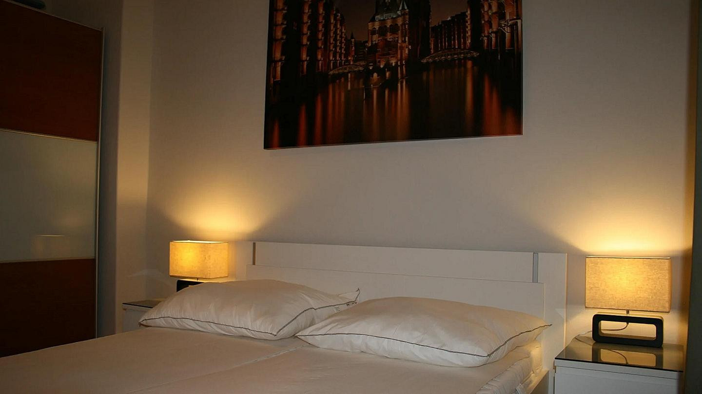 Das Schlafzimmer hat ein komfortables Bett (160x200 cm) sowie einen großen Kleiderschrank. Ein kleines helles schickes Badezimmer mit Regendusche und großen Spiegelschrank mit vielen Ablageflächen. Alle Räume sind dimmbar bis auf das Schlafzimmer.
