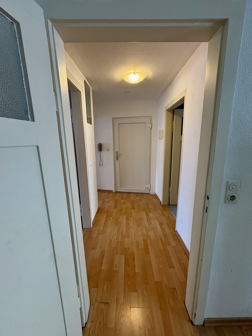 Die Raumaufteilung umfasst ein großzügiges Wohnzimmer, zwei Schlafzimmer sowie eine separate Küche mit Einbauküche. Das Badezimmer ist mit Dusche und Waschbecken ausgestattet. Das WC befindet sich separat auf derselben Etage und ist bequem direkt vor der Wohnung erreichbar.