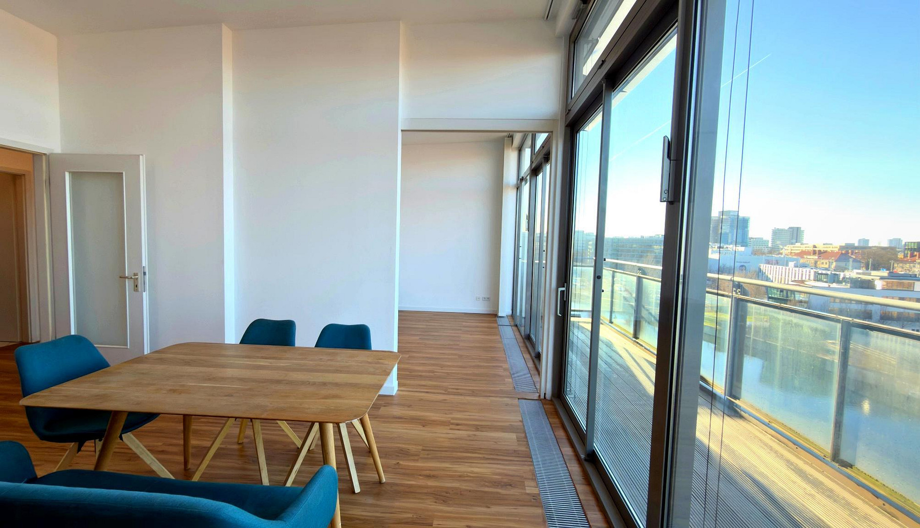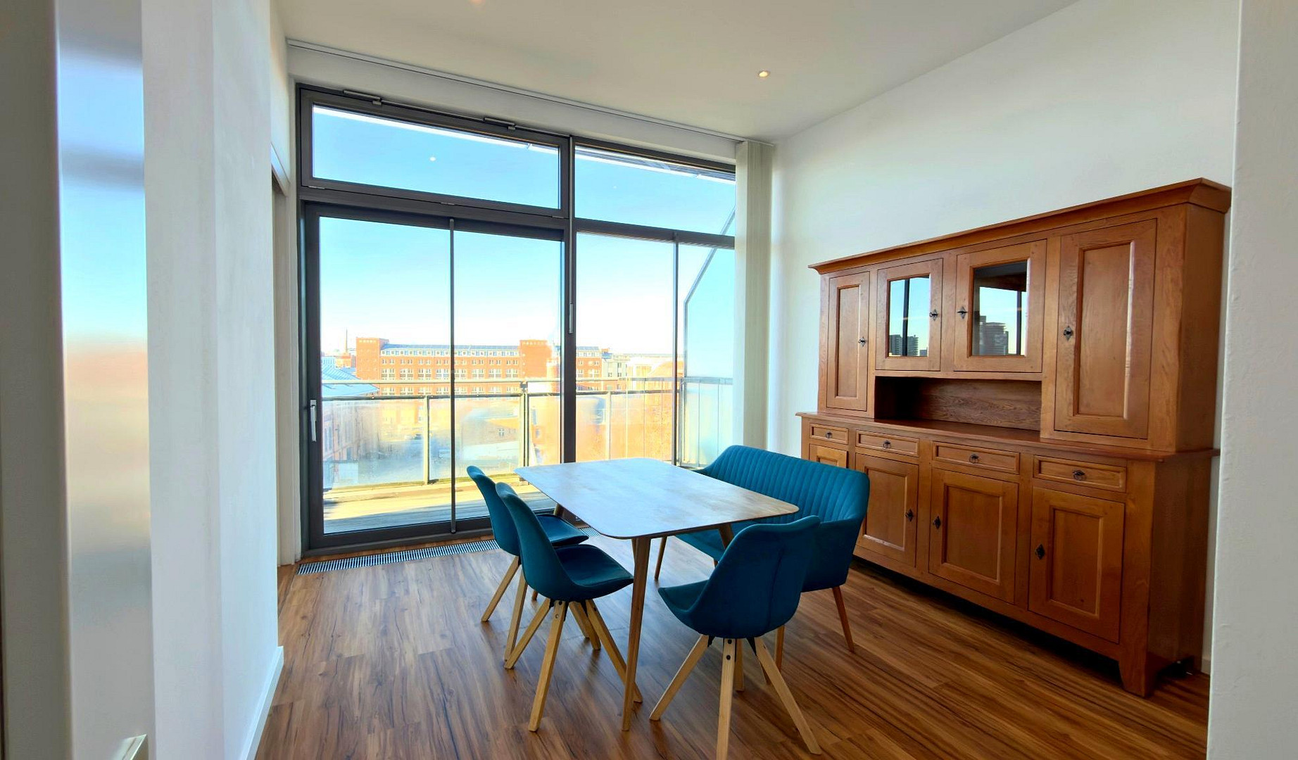 Die Ausstattung dieser Wohnung unterstreicht den hochwertigen Anspruch und das besondere Wohngefühl über den Dächern der Stadt. Großzügige Fensterflächen mit hochwertigen Aluminiumrahmen sorgen für eine lichtdurchflutete Atmosphäre und schaffen fließende Übergänge zwischen Innenraum und Aussicht.