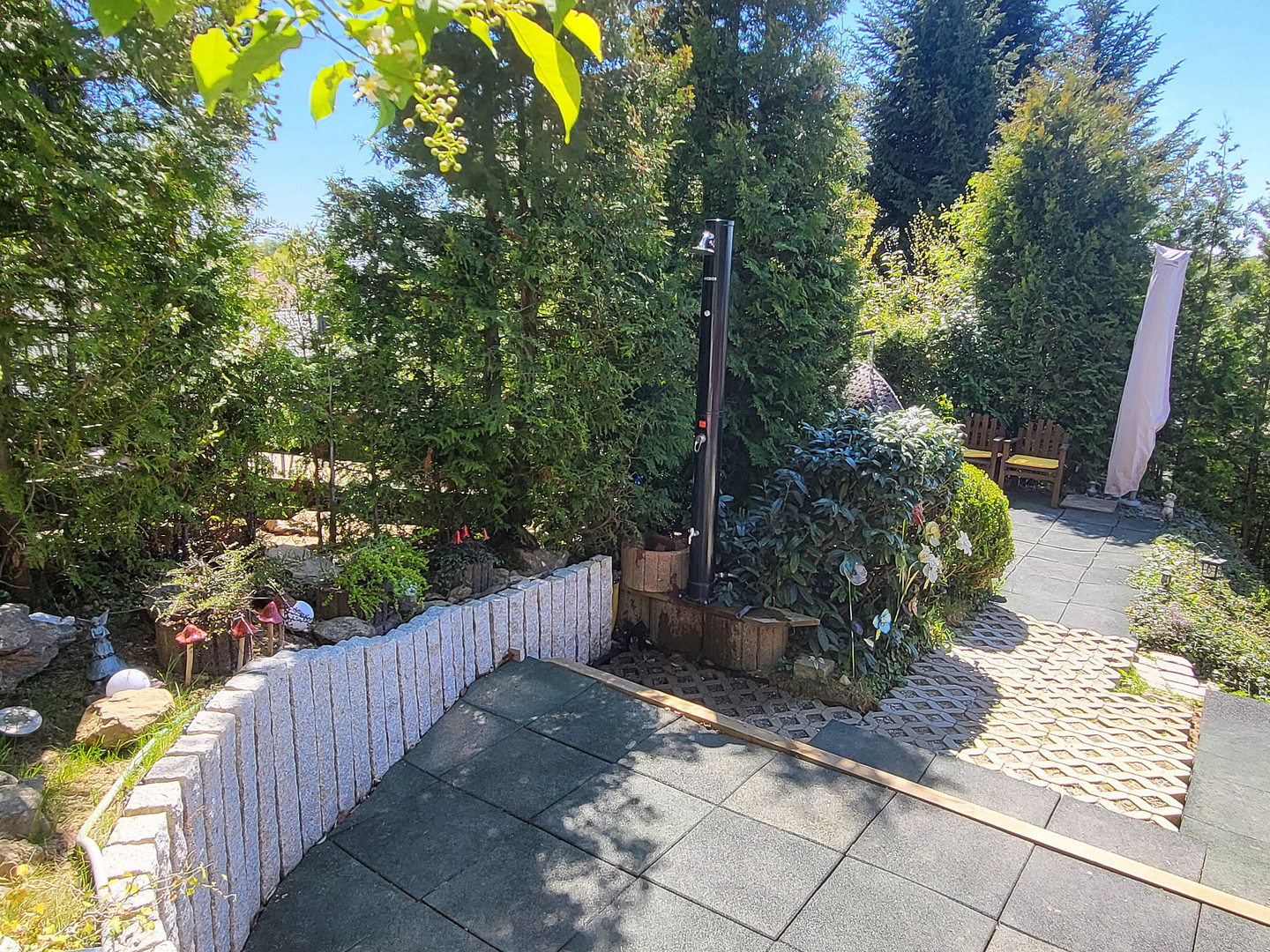 Das Haus ist umlaufend von Gartenflächen umgeben. Ein Paradies für Gartenliebhaber. Im Untergeschoß vor dem Haus, die Südseite bzw. die Straßenseite wird die Rasenfläche von 3 Sumpfeichen beschatet, eine Thuja Hecke dient als Fallschutz zur Straße. Die westliche Böschung bis zum Haupteingang am Obergeschoß ist mit Stauden und Bodendecker bepflanzt. Die zahlreichen Felsen betönen den tipischen Charakter der Gegend. Hinter dem Haus ist eine weitere sonnige Wiese mit Rasenfläche und 2 Obstbäume vorhanden. An der Ostseite gibt es eine 15m² überdachte Terasse mit Fernsicht zu Brotjacklriegel, eine weitere 30m² große Terasse/Grillplatz umgeben von Granitmauer, ein kleiner Zwischenpodest für unser jacuzzi whirlpool, sowie ein weiterer Plateau 3x4m mit Sonnenschirm und Sitzgelegenheiten.