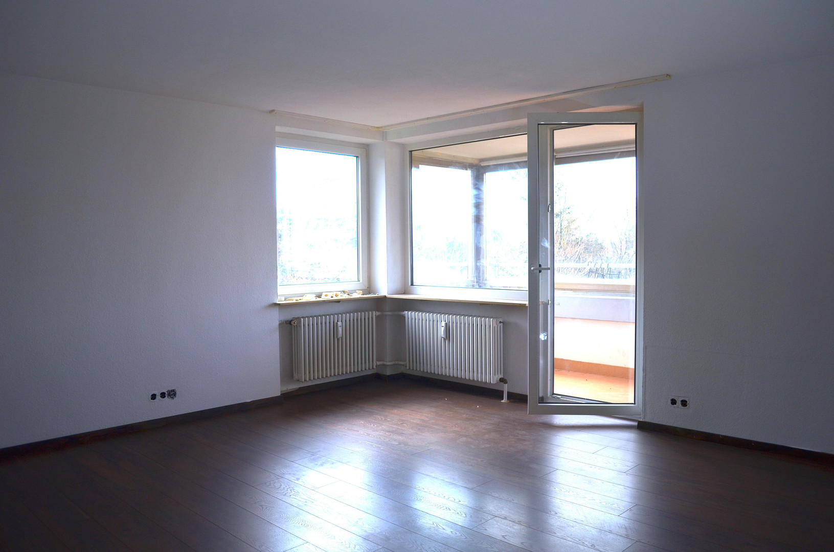 Das Wohnzimmer ist mit einem Südfenster und der Fensterfront nach Westen zum Balkon hell und freundlich. Es ist groß genug, um auch einen Essplatz einzurichten oder einen Homeoffice-Arbeitsplatz.