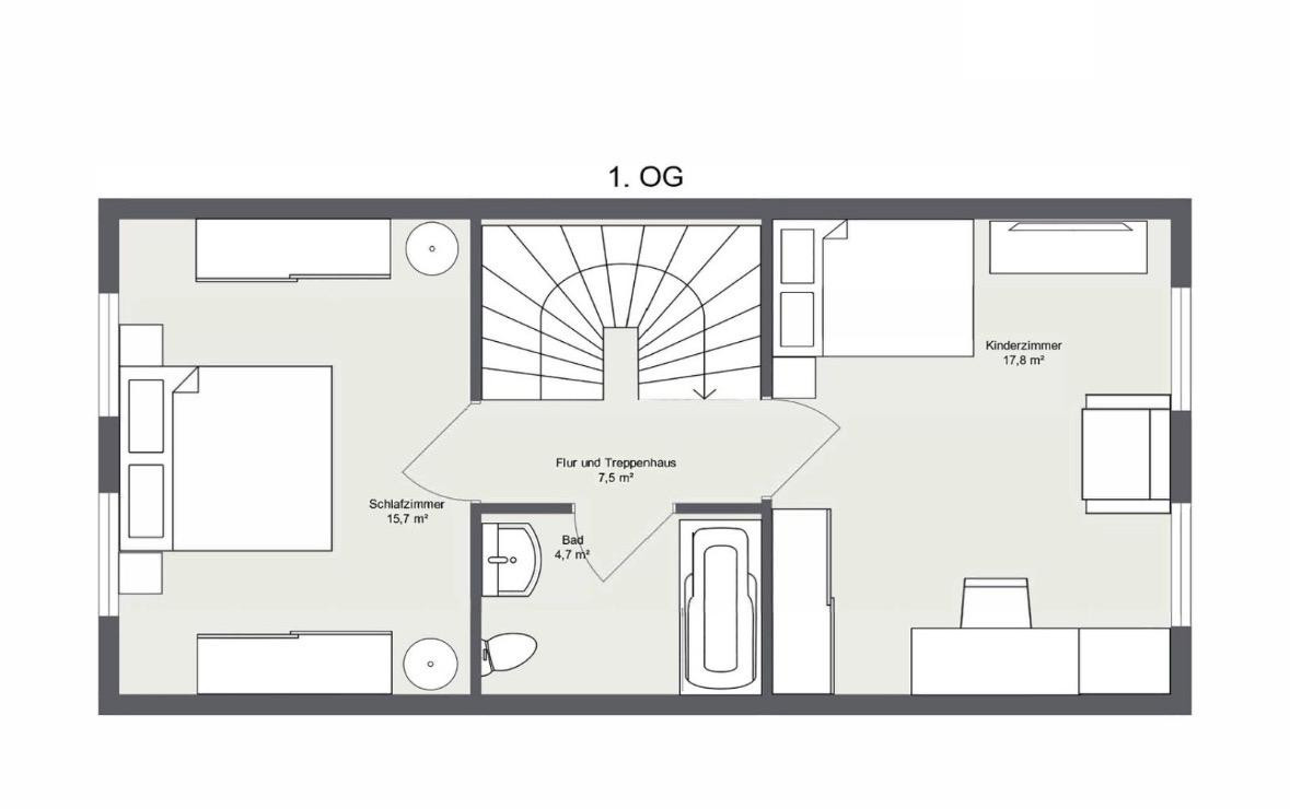 Im 1. OG sind ein Bad mit Badewanne sowie zwei Zimmer vorhanden, die sich ideal als Schlaf- oder Kinderzimmer eigenen. In beiden Zimmern sind jeweils 2 Fenster mit Rollladen.