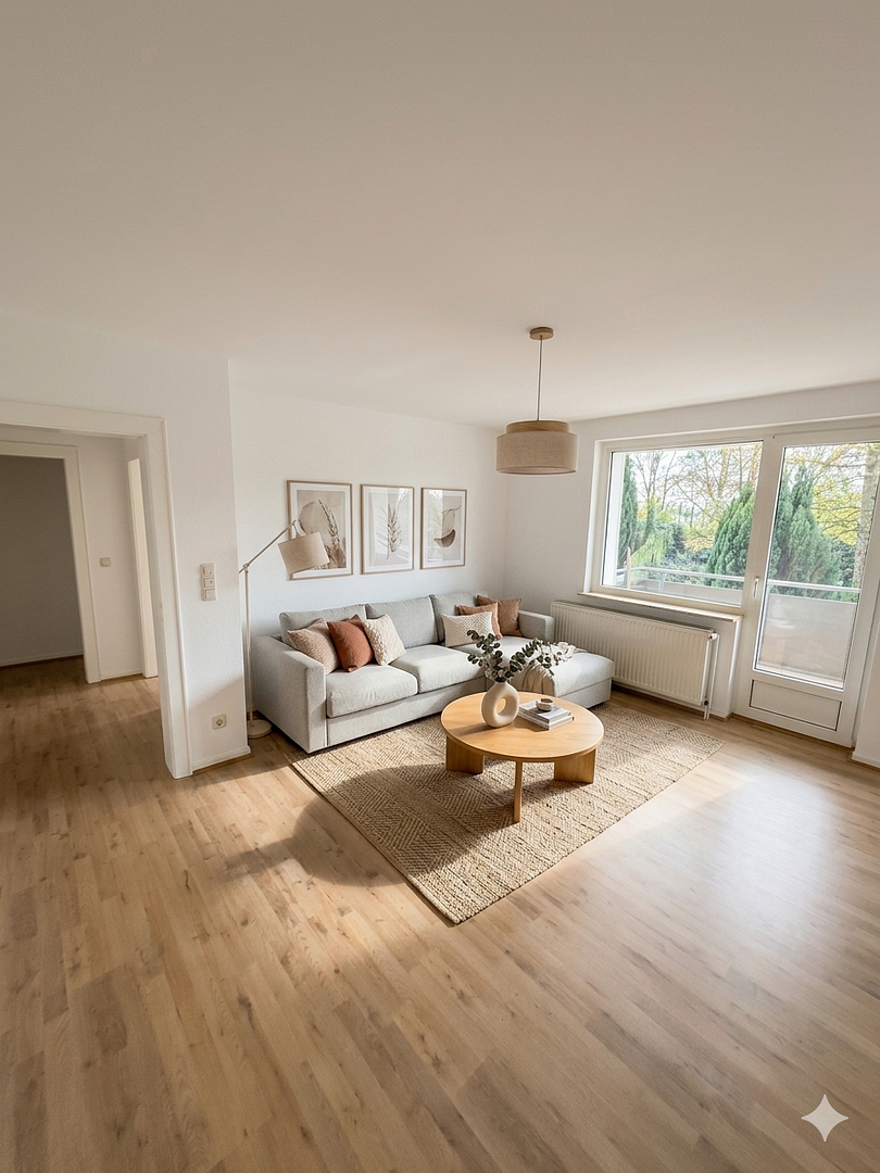 Vom Flur aus erreichen Sie alle Räume bequem. Das großzügige Wohnzimmer bildet das Herzstück der Wohnung und bietet direkten Zugang zum Balkon – der perfekte Ort für den Kaffee am Morgen oder ein Glas Wein am Feierabend. Das Schlafzimmer bietet ausreichend Stellfläche für ein großes Doppelbett und eine Schrankwand.