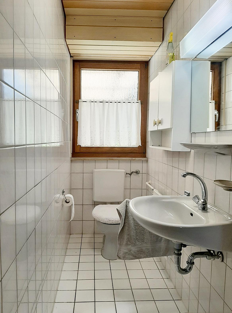 das Bad im OG ist noch im 1970er-Originalzustand, eine Kaltwasserleitung ist verkalkt sowie Elektrische Leitungen/Sicherungen