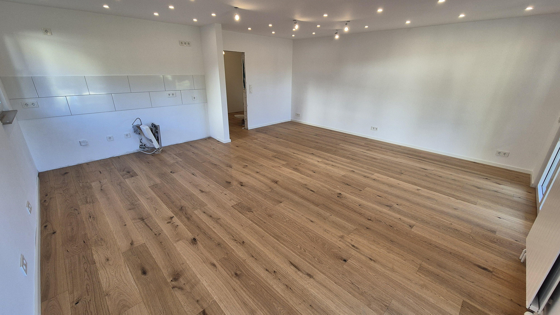 Auf ca. 63 m² Wohnfläche erwartet Sie ein geräumiger Flur, sowie ein Schlafzimmer in angenehmer Größe und ein lichtdurchflutetes und großzügiges Wohnzimmer. Der gesamte Wohnbereich, mit Ausnahme vom Bad, sind mit hochwertigem Eichenparkett (Landhausdiele geölt) ausgestattet und verleiht den Räumen so eine warme und stilvolle Atmosphäre. Im Wohnzimmer können die Spots in 3 Zonen (Wohnen, Essen, Kochen) separat geschaltet und in der Helligkeit und Lichtfarbe reguliert werden.