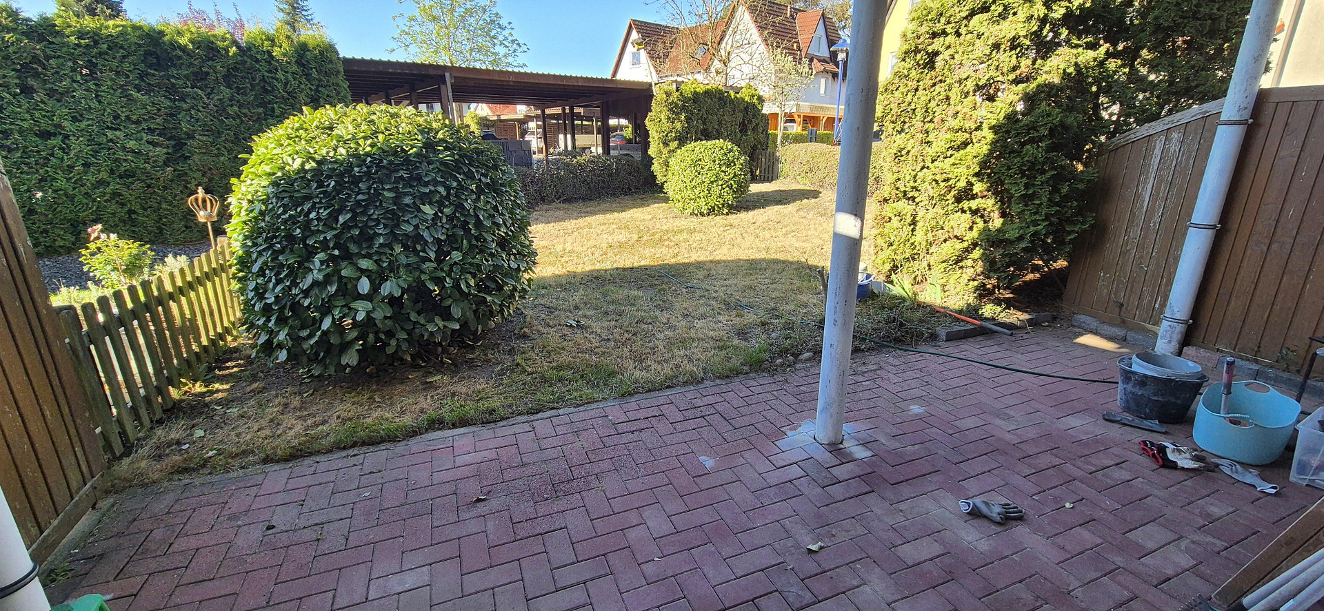 Von hier aus können Sie den Blick in den etwa 90 m², großen Garten genießen. Ideal, wenn man die Arbeit in Grenzen halten will und trotzdem groß genug, um sich wohlzufühlen. Ergänzt wird dies durch eine ca. 12 m² große Terrasse.