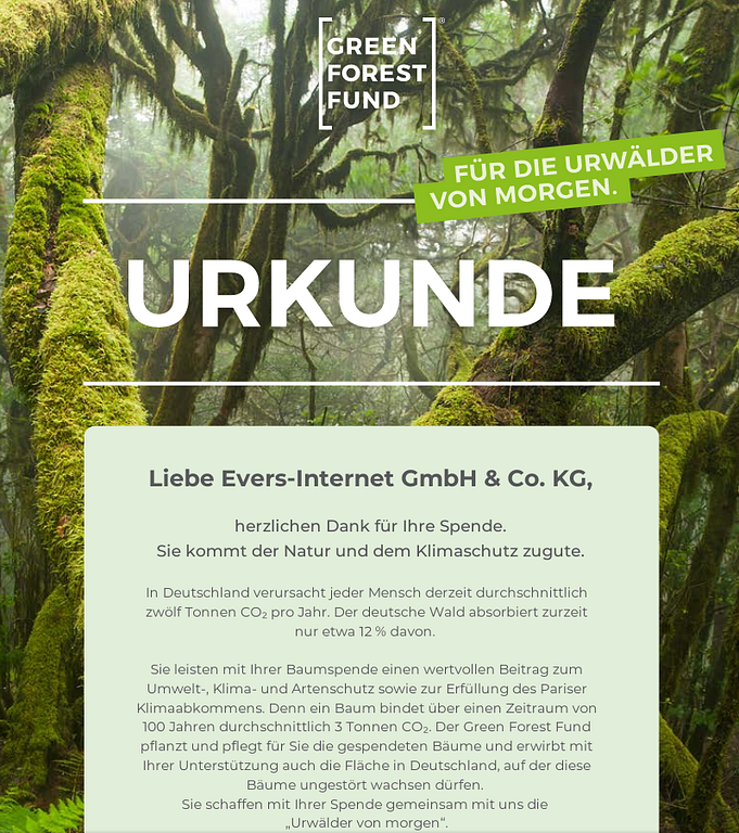 Das haben wir in Kooperation mit dem Green Forest Fund getan, denn deren Mission ist es, die Urwälder von morgen zu schaffen. Dabei geht diese Stiftung auf sympathische Weise pragmatisch vor. Credo ist: Der Urwald von morgen funktioniert nicht nur mit der Anpflanzung neuer Bäume, sondern auch „mit der Erhaltung bestehender Wälder. Diese wandeln wir um in Urwälder, in denen die Bäume frei und ungestört wachsen dürfen. Mit unserer neuen Urwaldspende können Sie uns beim Helfen helfen. Wir machen Wälder stark. Indem wir sie schützen, statt sie zu nützen. Während 98 % der Waldfläche in Deutschland forstwirtschaftlich genutzt wird, dürfen unsere Bäume natürlich alt werden. Auf unseren Schutzflächen werden die Bäume Teil eines neuen Urwaldes – mitten in Deutschland. So werde diese Wälder zu stabilen Zukunfts- bzw. Klimawäldern.“