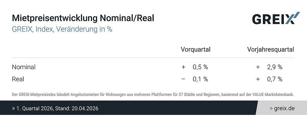 Die Mietpreise sind im ersten Quartal 2026 um 0,5 Prozent gestiegen. Im Jahresvergleich liegt das Wachstum bei 2,9 Prozent und damit so niedrig wie seit vier Jahren nicht mehr. Der Anstieg wäre damit auf Niveau der Inflationsrate.