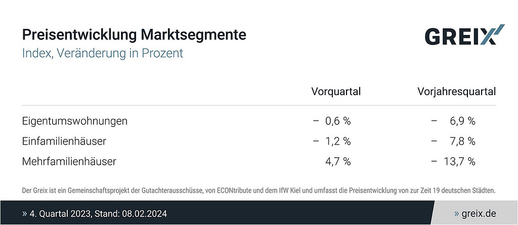 Das IfW bietet mit Kooperationspartnern den German Real Estate Index (GREIX). Dieser zeigt die Preisentwicklung von Immobilien und Mieten, aufgeschlüsselt nach Immobilienart. Demnach ist der Preis für Immobilien 2023 insgesamt so stark gefallen wie nie zuvor seit den 1960er-Jahren.