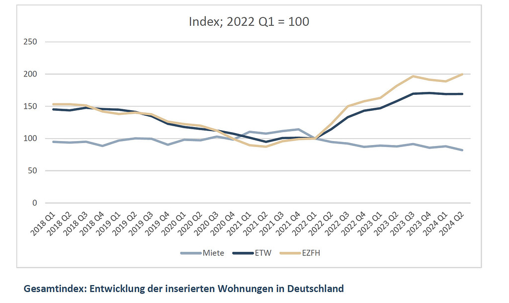 Die Anzahl der Immobilienangebote ist deutlich gewachsen. Seit der sogenannten Zinswende im ersten Quartal 2022 gibt es 69 Prozent mehr Eigentumswohnungen und doppelt so viele Ein- und Zweifamilienhäuser, die zum Verkauf stehen. Das IW sieht als eine Ursache, dass durch die erhöhten Zinsen die Nachfrage nach Wohneigentum stark zurückgegangen ist. Zugleich gab es mehr Angebote. Das ist für das IW eine Hauptursache für den Preisverfall der letzten zwei Jahre.