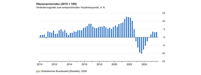 Das Statistische Bundesamt (Destatis) hat zum Jahresende 2025 Daten zum dritten Quartal 2025 veröffentlicht. Demnach sind die Immobilienpreise gegenüber dem Vorjahresquartal um 3,3 Prozent gestiegen. Der positive Trend der letzten zwei Jahre setzt sich fort.