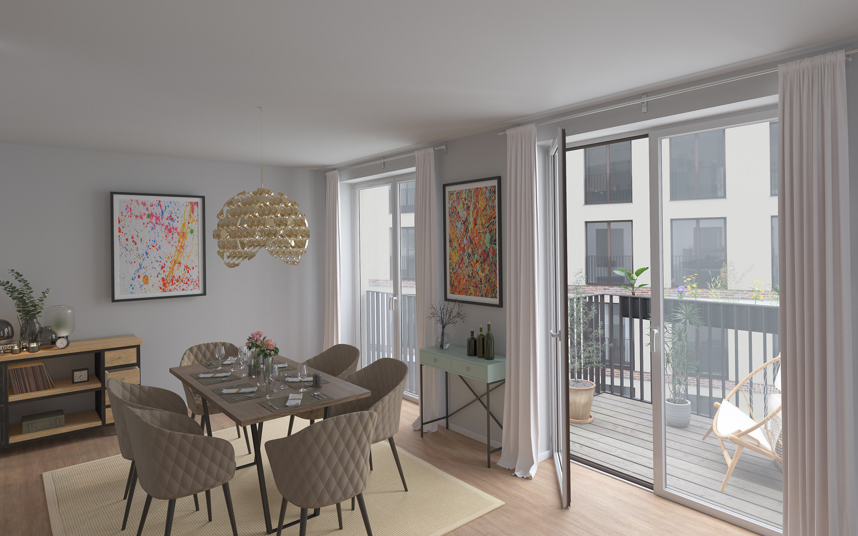 In einer der begehrtesten Lagen Jenas, gegenüber dem Damenviertel, entstehen die Dornburger Flats. Ein modernes und nachhaltiges Wohnprojekt, das den Ansprüchen eines Mehr-Generationenhauses gerecht wird. Dieses exklusive Bauvorhaben – mit 63 Wohneinheiten und 72 PKW-Stellplätzen in der Tiefgarage – schafft eine Balance zwischen Nachhaltigkeit, Komfort und Moderne. Die großzügigen Entrées der Gebäude sorgen für einen repräsentativen und einladenden Eintritt in das neue Zuhause, in dem alle Wohnungen barrierefrei zu erreichen sind. Die Gebäude erfüllen den KfW 40 Standard, was nicht nur den Energieverbrauch erheblich senkt, sondern auch ein gesundes Wohnklima fördert. Ein besonderes Highlight sind die Dachterrassen – nutzbar von jedem Bewohner – mit Blick über die Innenstadt Jenas, die mit intensiver Begrünung ausgestattet sind und somit nicht nur einen hohen Freizeitwert bieten, sondern auch zur Verbesserung des Mikroklimas beitragen. Zudem stehen den Bewohnern die Anschlussmöglichkeit von PKWElektrotankstellen zur Verfügung, um die Nutzung von Elektrofahrzeugen zu unterstützen und die Umwelt zu schonen. Ein weiteres umweltfreundliches feature ist das Regenwasser-RecyclingSystem, das effektiv zur Reduzierung des Wasserverbrauchs beiträgt. Die Ausstattung der Wohnungen lässt keine Wünsche offen. Hochwertige Materialien und eine durchdachte Gestaltung schaffen ein elegantes und komfortables Wohnambiente. Die offenen Wohn- und Essbereiche bieten viel Platz für Individualität und geselliges Beisammensein. Ein besonderer Service ist die hauseigene Paketstation, die sicherstellt, dass keine Pakete mehr verpasst werden. Für die Sicherheit der Bewohner sorgen rauchfrei gehaltene Sicherheitstreppenhäuser, über die im Brandfall ein ruhiges und sicheres Verlassen der Gebäude gewährleistet ist. Dieses Wohnprojekt ist nicht nur eine Investition in ein komfortables Zuhause, sondern auch in eine nachhaltige Zukunft.