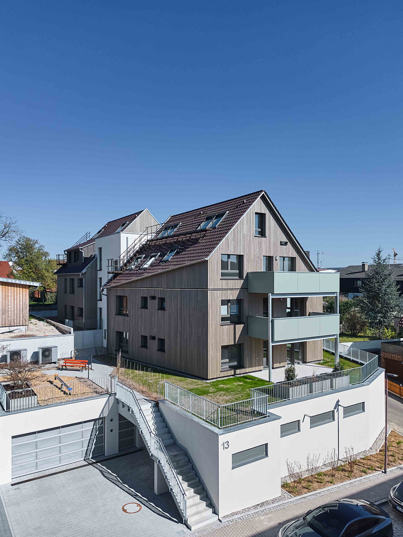 Das klimafreundliche Mehrfamilienhaus wurde an einem Südhang in der Bogenstraße 13 in Affalterbach gebaut und befindet sich in einer sehr zentralen, gewachsenen und verkehrsberuhigten Lage. Geschäfte für den täglichen Bedarf, Bushaltestellen, Kindergärten, die Schule und das Naherholungsgebiet sind