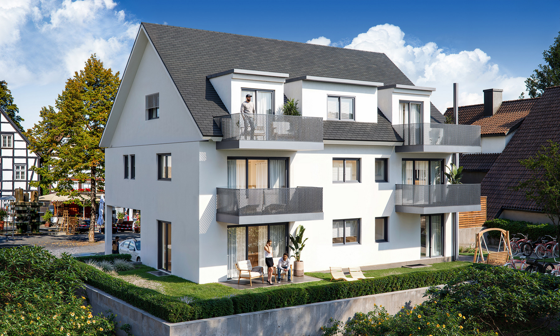 Abgerundet wird das Haus durch die familienfreundliche 4-Zimmer-Wohnung im Dachgeschoss, dank der zahlreichen Gauben ohne einschränkende Dachschrägen. Auch hier sind ein separates Gäste-WC sowie zusätzlich eine Abstellkammer als weiteres Ausstattungsmerkmal vorzufinden. Das größte Highlight ist jedoch sicherlich, dass sowohl das Wohn- als auch das Hauptschlafzimmer über einen Balkon verfügen. Alle Einheiten zeichnen sich durch praktische Grundrisse und eine offene Küche hin zum Wohn- und Essbereich aus. Hinzu kommt der zusätzliche Stauraum im eigenen Kellerabteil und ein bis zwei Außenstellplätze pro Wohneinheit für die Autos.
