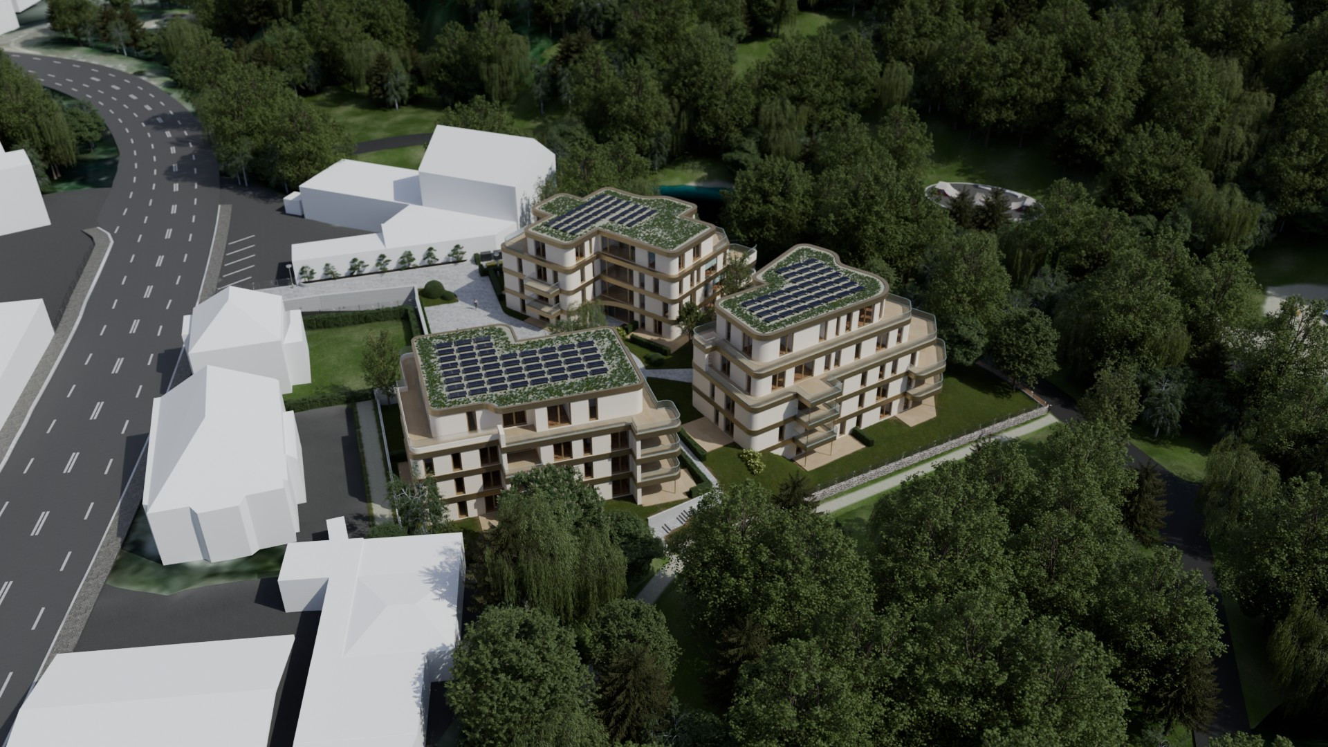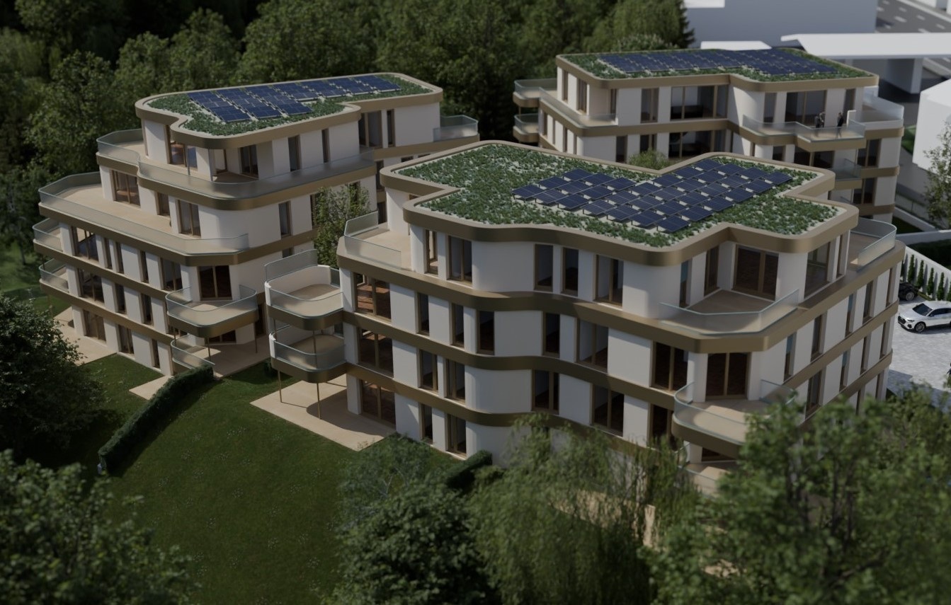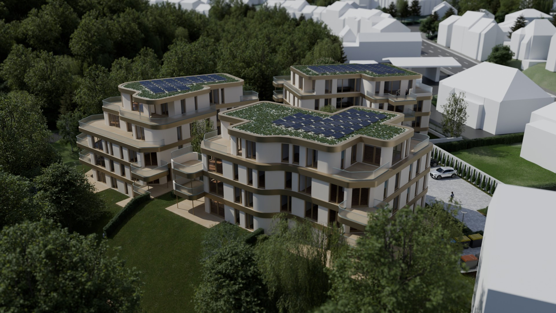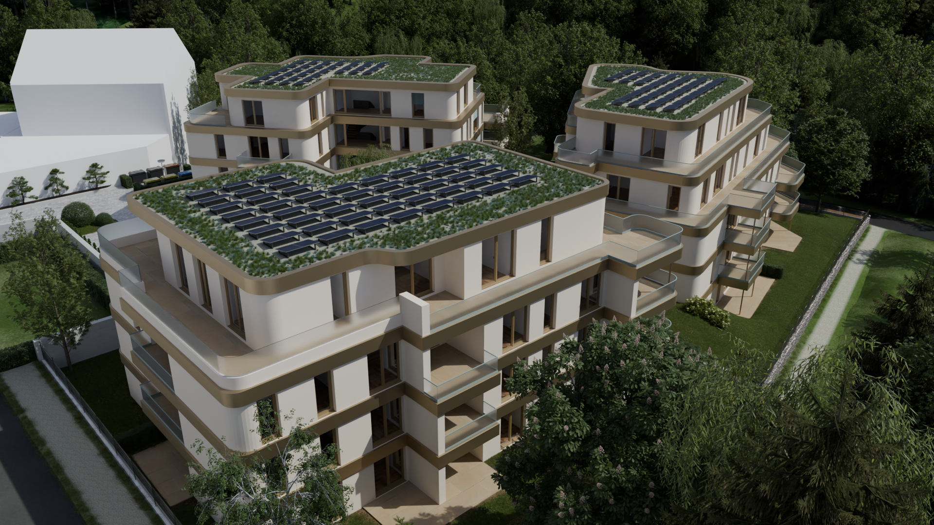 Ein aufwendiges ökologisches Konzept mit begrünten Dächern und mit ansprechender Bepflanzung des Grundstücks, dazu modernste Technik wie Fußbodenheizung, Photovoltaik, Luftwärmepumpen oder kontrollierte Wohnraumlüftung mit Wärmerückgewinnung und Kühlfunktion tragen zur Besonderheit und Nachhaltigkeit dieses Projektes bei.