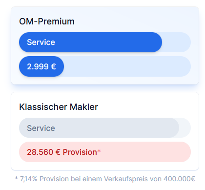 Die zweite Option ist, das Angebot von ohne-makler.net zu nutzen. Wir bieten leistungsstarke Angebote, um den Verkauf Ihrer Immobilie so einfach und effektiv wie möglich zu gestalten. Entscheiden Sie sich für dieses Angebot, beraten wir Sie gern. Sie sparen erhebliche Kosten durch den Wegfall der Maklerprovision und vermarkten Ihre Immobilie dennoch professionell.