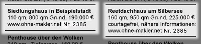 Tipp: Verweisen Sie auf Ihre Internetanzeige, machen Sie deutlich, dass es dort noch viel mehr Informationen über die Immobilie gibt. Das bedeutet auch: Beachten Sie bitte die Reihenfolge - erst kommt das Online-Inserat, dann die Zeitungsanzeige. Und wenn eins auf das andere Bezug nimmt, sollten natürlich auch die Laufzeiten aufeinander abgestimmt sein.
